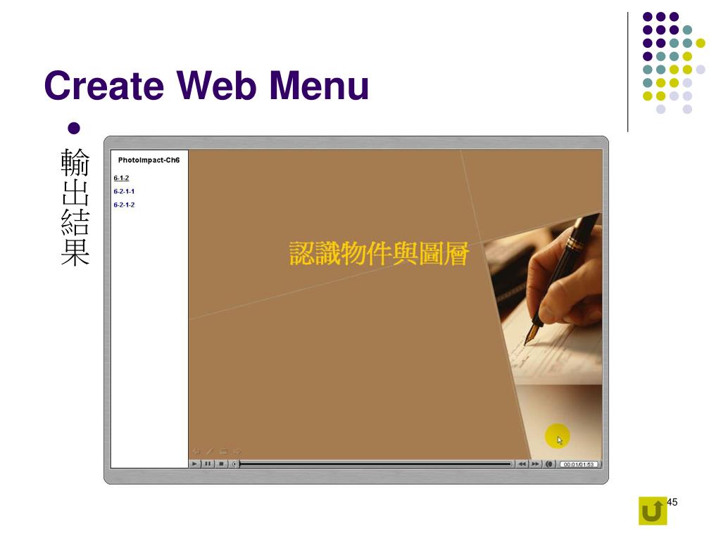 Create Web Menu • 使用Theater將多個SWF檔案成整合成一個含有選單的Flash檔案 • Task list > Produce>Create Web Menu • 使用Legacy SWF output template在 Menu List box中加入SWF檔案 • 不可使用Flash FLV 檔案 • 最後按Export Flash Menu鈕