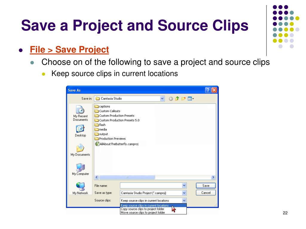 Save a Project and Source Clips • File > Save Project • Choose on of the following to save a project and source clips • Keep source clips in current locations