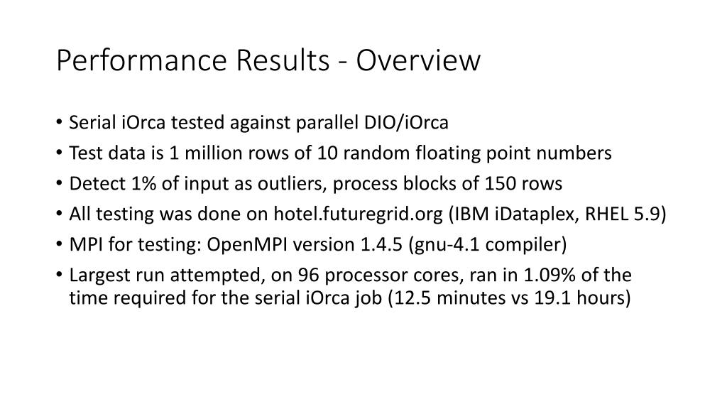 Performance Results - Overview • Serial iOrca tested against parallel DIO/iOrca • Test data is 1 million rows of 10 random floating point numbers • Detect 1% of input as outliers, process blocks of 150 rows • All testing was done on hotel.futuregrid.org (IBM iDataplex, RHEL 5.9) • MPI for testing: OpenMPI version 1.4.5 (gnu-4.1 compiler) • Largest run attempted, on 96 processor cores, ran in 1.09% of the time required for the serial iOrca job (12.5 minutes vs 19.1 hours)