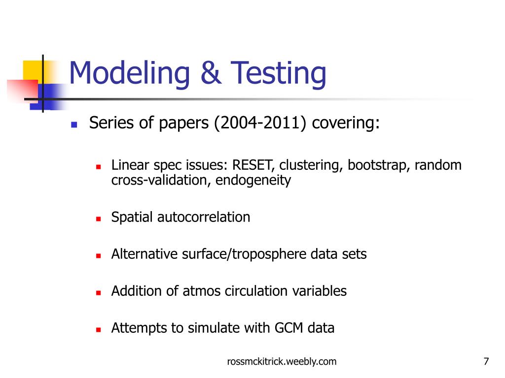 Modeling & Testing • Series of papers (2004-2011) covering: • Linear spec issues: RESET, clustering, bootstrap, random cross-validation, endogeneity • Spatial autocorrelation • Alternative surface/troposphere data sets • Addition of atmos circulation variables • Attempts to simulate with GCM data rossmckitrick.weebly.com