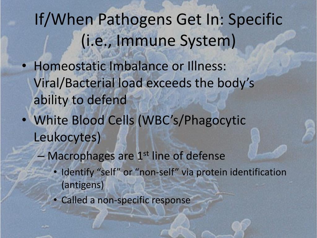If/When Pathogens Get In: Specific (i.e., Immune System) • Homeostatic Imbalance or Illness: Viral/Bacterial load exceeds the body’s ability to defend • White Blood Cells (WBC’s/Phagocytic Leukocytes) • Macrophages are 1st line of defense • Identify “self” or “non-self” via protein identification (antigens) • Called a non-specific response