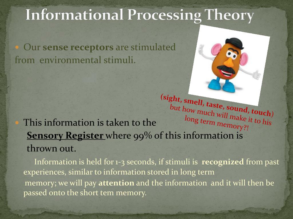 Informational Processing Theory • Our sense receptors are stimulated from environmental stimuli. • This information is taken to the Sensory Register where 99% of this information is thrown out. Information is held for 1-3 seconds, if stimuli is recognized from past experiences, similar to information stored in long term memory; we will pay attention and the information and it will then be passed onto the short tem memory. (sight, smell, taste, sound, touch) but how much will make it to his long term memory?!