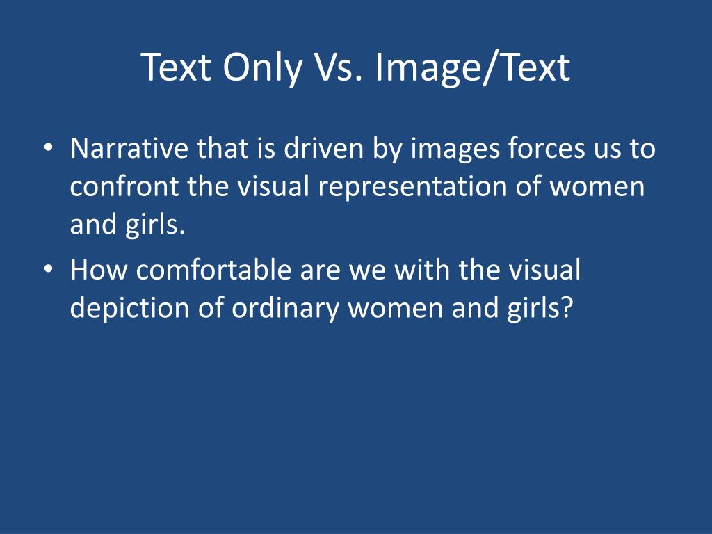 Text Only Vs. Image/Text • Narrative that is driven by images forces us to confront the visual representation of women and girls. • How comfortable are we with the visual depiction of ordinary women and girls?