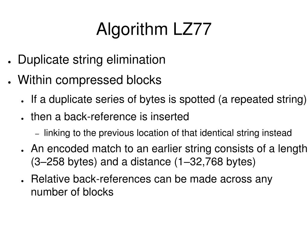 Algorithm LZ77 Duplicate string elimination Within compressed blocks If a duplicate series of bytes is spotted (a repeated string) then a back-reference is inserted linking to the previous location of that identical string instead An encoded match to an earlier string consists of a length (3–258 bytes) and a distance (1–32,768 bytes) Relative back-references can be made across any number of blocks