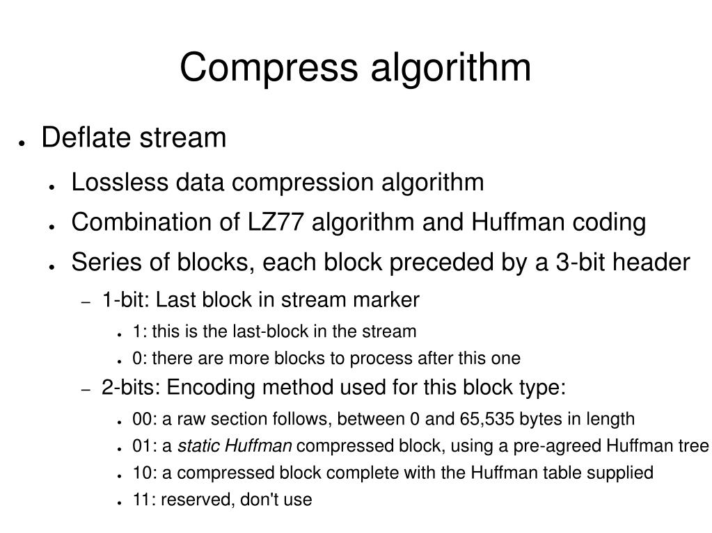 Compress algorithm Deflatestream Lossless data compression algorithm Combination of LZ77 algorithm and Huffman coding Series of blocks, each block preceded by a 3-bit header 1-bit: Last block in stream marker 1: this is the last-block in the stream 0: there are more blocks to process after this one 2-bits: Encoding method used for this block type: 00: a raw section follows, between 0 and 65,535 bytes in length 01: a static Huffman compressed block, using a pre-agreed Huffman tree 10: a compressed block complete with the Huffman table supplied 11: reserved, don't use