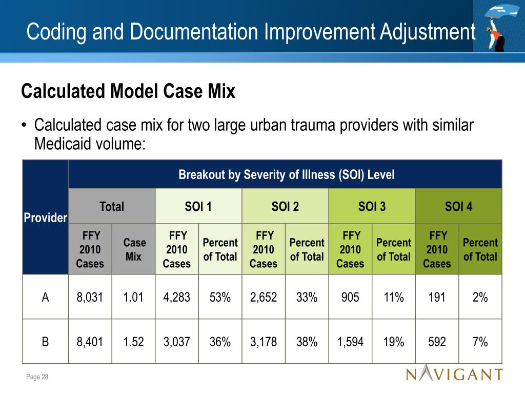 Coding and Documentation Improvement Adjustment • Calculated Model Case Mix • Calculated case mix for two large urban trauma providers with similar Medicaid volume: