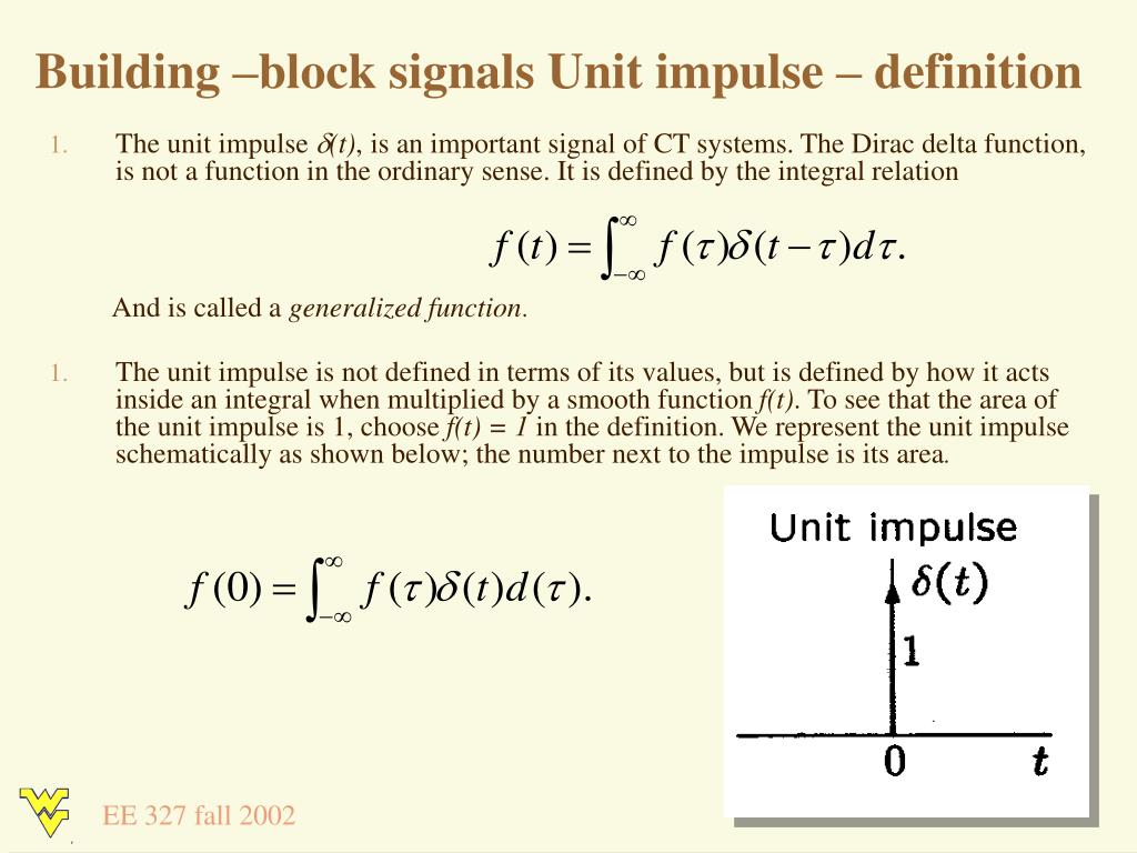 Building –block signals Unit impulse – definition • The unit impulse (t), is an important signal of CT systems. The Dirac delta function, is not a function in the ordinary sense. It is defined by the integral relation And is called a generalized function. • The unit impulse is not defined in terms of its values, but is defined by how it acts inside an integral when multiplied by a smooth function f(t). To see that the area of the unit impulse is 1, choose f(t) = 1 in the definition. We represent the unit impulse schematically as shown below; the number next to the impulse is its area. EE 327 fall 2002