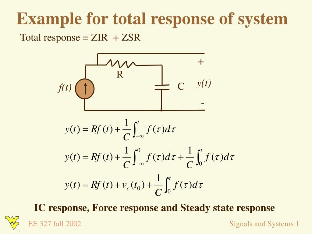 Example for total response of system + Total response = ZIR + ZSR R y(t) C f(t) - IC response, Force response and Steady state response EE 327 fall 2002 Signals and Systems 1