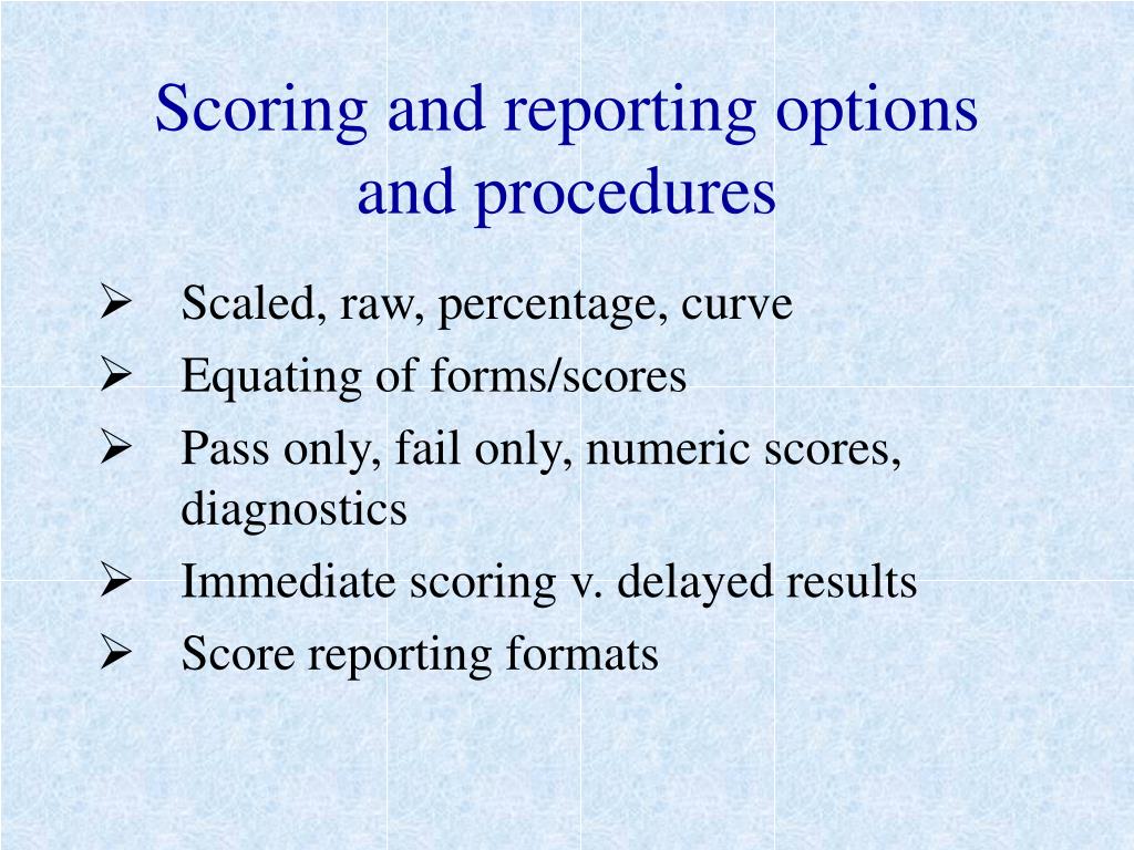 Scoring and reporting options and procedures • Scaled, raw, percentage, curve • Equating of forms/scores • Pass only, fail only, numeric scores, diagnostics • Immediate scoring v. delayed results • Score reporting formats