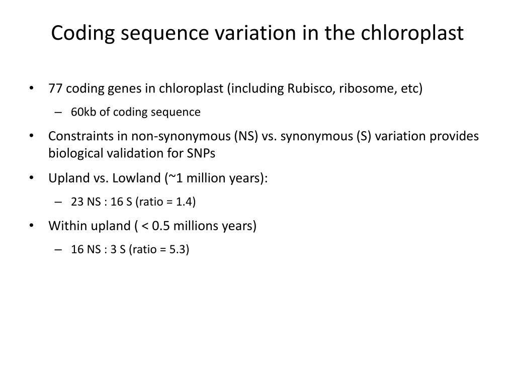 Coding sequence variation in the chloroplast • 77 coding genes in chloroplast (including Rubisco, ribosome, etc) • 60kb of coding sequence • Constraints in non-synonymous (NS) vs. synonymous (S) variation provides biological validation for SNPs • Upland vs. Lowland (~1 million years): • 23 NS : 16 S (ratio = 1.4) • Within upland ( < 0.5 millions years) • 16 NS : 3 S (ratio = 5.3)