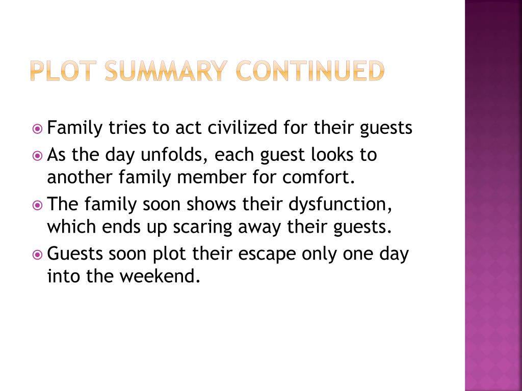 Plot summary continued • Family tries to act civilized for their guests • As the day unfolds, each guest looks to another family member for comfort. • The family soon shows their dysfunction, which ends up scaring away their guests. • Guests soon plot their escape only one day into the weekend.