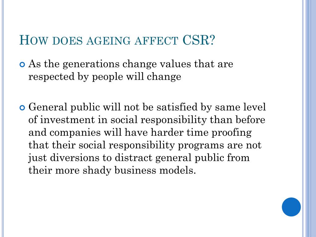 Howdoesageingaffect CSR? • As the generations change values that are respected by people will change • General public will not be satisfied by same level of investment in social responsibility than before and companies will have harder time proofing that their social responsibility programs are not just diversions to distract general public from their more shady business models.