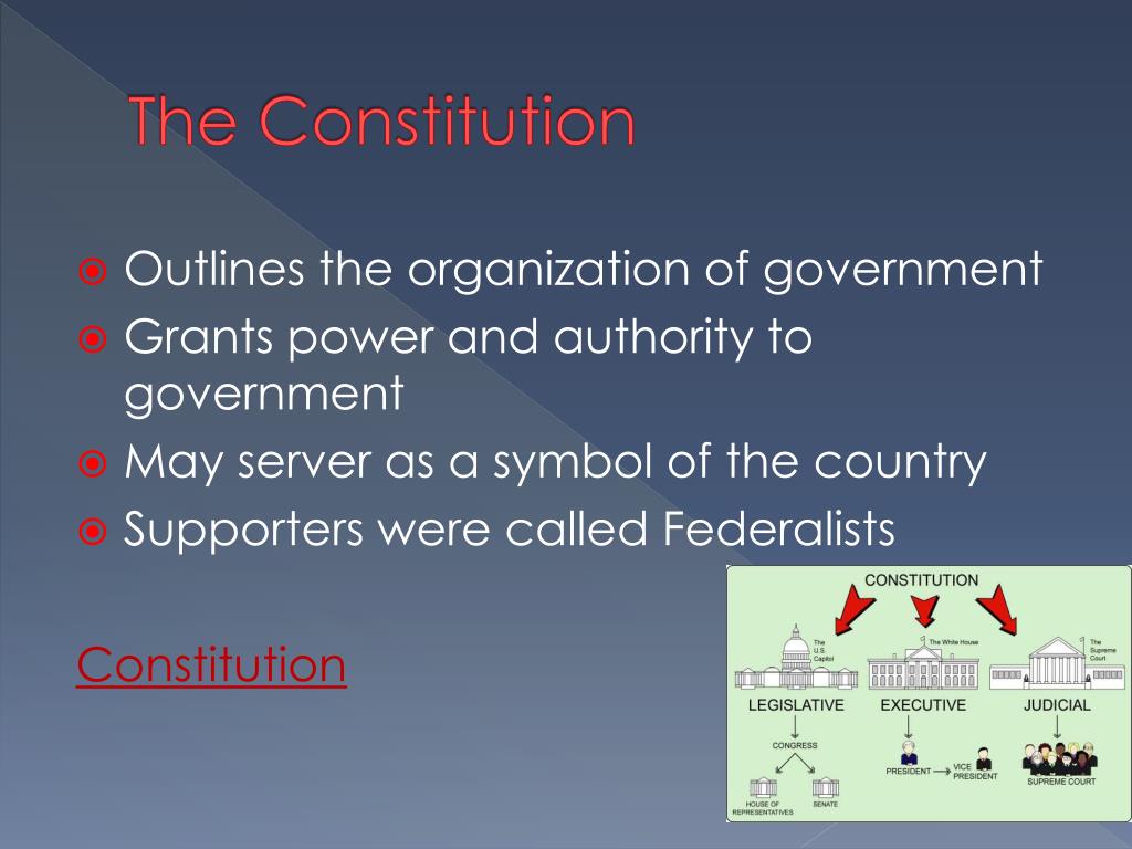 The Constitution • Outlines the organization of government • Grants power and authority to government • May server as a symbol of the country • Supporters were called Federalists Constitution