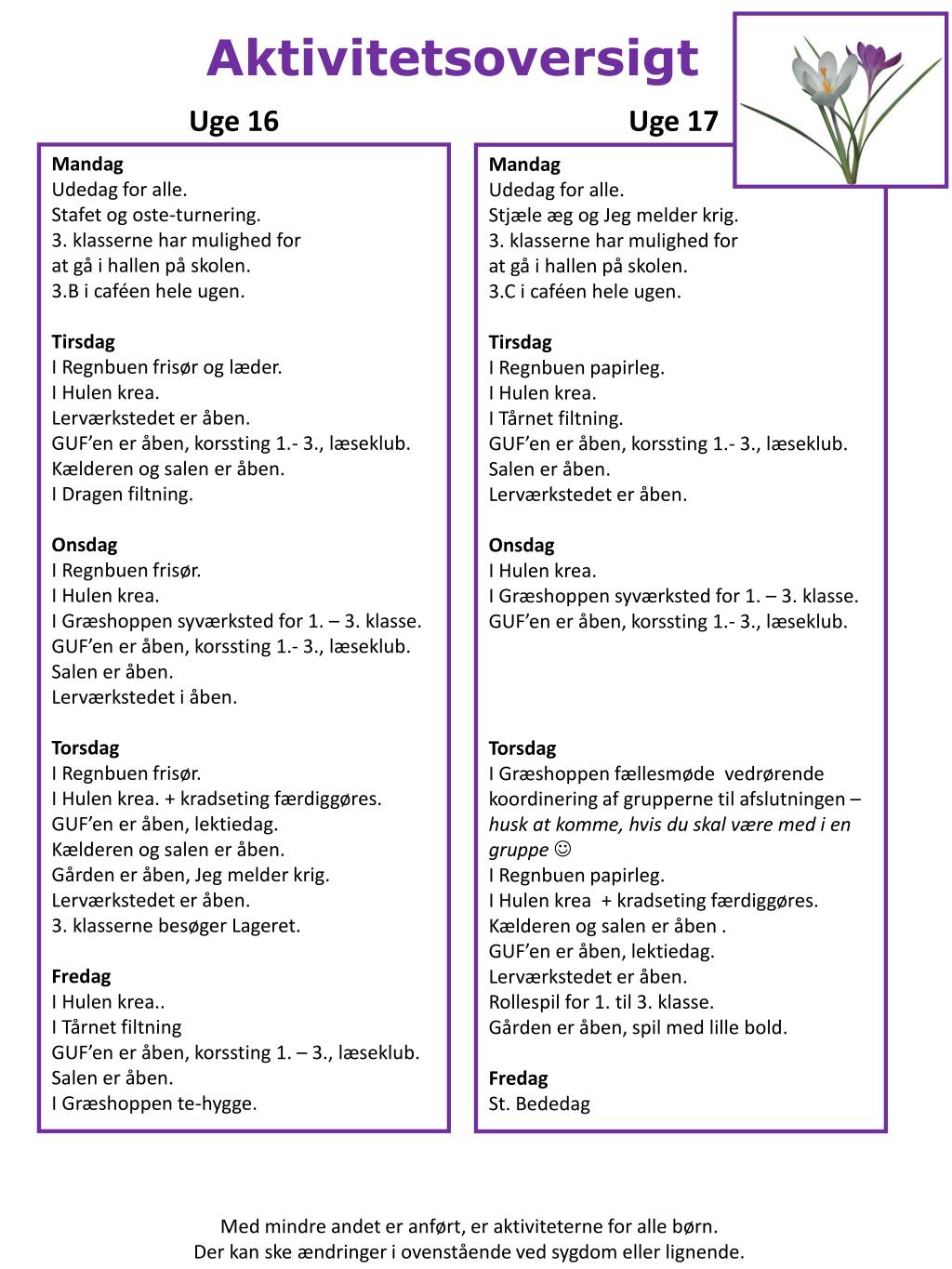 Aktivitetsoversigt . Uge 16. Uge 17. Mandag Udedag for alle. Stafet og oste-turnering. 3. klasserne har mulighed for at gå i hallen på skolen. 3.B i caféen hele ugen. Tirsdag I Regnbuen frisør og læder. I Hulen krea . Lerværkstedet er åben .