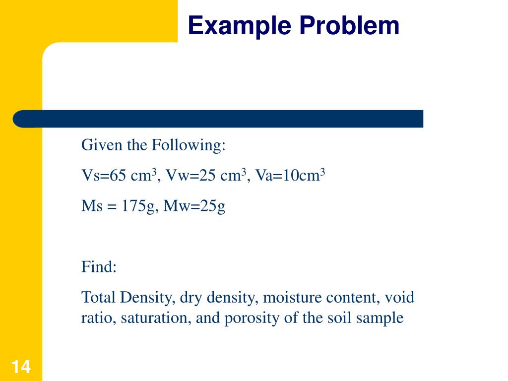 Example Problem Given the Following: Vs=65 cm3, Vw=25 cm3, Va=10cm3 Ms = 175g, Mw=25g Find: Total Density, dry density, moisture content, void ratio, saturation, and porosity of the soil sample