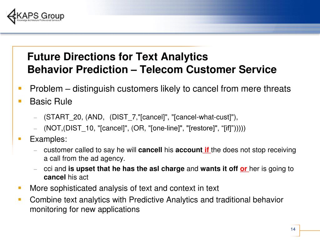 Future Directions for Text AnalyticsBehavior Prediction – Telecom Customer Service • Problem – distinguish customers likely to cancel from mere threats • Basic Rule • (START_20, (AND, (DIST_7,"[cancel]", "[cancel-what-cust]"), • (NOT,(DIST_10, "[cancel]", (OR, "[one-line]", "[restore]", “[if]”))))) • Examples: • customer called to say he will cancell his account if the does not stop receiving a call from the ad agency. • cci and is upset that he has the asl charge and wants it offor her is going to cancel his act • More sophisticated analysis of text and context in text • Combine text analytics with Predictive Analytics and traditional behavior monitoring for new applications