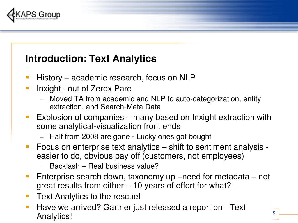 Introduction: Text Analytics • History – academic research, focus on NLP • Inxight –out of ZeroxParc • Moved TA from academic and NLP to auto-categorization, entity extraction, and Search-Meta Data • Explosion of companies – many based on Inxight extraction with some analytical-visualization front ends • Half from 2008 are gone - Lucky ones got bought • Focus on enterprise text analytics – shift to sentiment analysis - easier to do, obvious pay off (customers, not employees) • Backlash – Real business value? • Enterprise search down, taxonomy up –need for metadata – not great results from either – 10 years of effort for what? • Text Analytics to the rescue! • Have we arrived? Gartner just released a report on –Text Analytics!