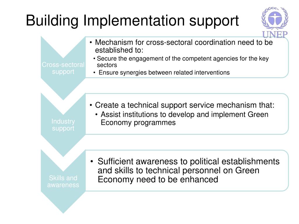 Programmatic approach to Institutional Innovation Identifying the strategic entry points Mainstreaming into Policy Process Building Implementation support Component • Understanding existing institutional set up • Identifying limitations and useful entry points • Consensus on elements of strategic measures • Existing opportunities for Innovation utilized • Key policy instruments for innovation developed • Capacity on transition management enhanced • Cross-sectoral support for implementation created • Capacities of technical support providers enhanced • Green Economy mainstreamed in national policies Outputs