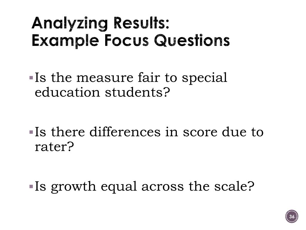 Analyzing Results: Example Focus Questions • Is the measure fair to special education students? • Is there differences in score due to rater? • Is growth equal across the scale?