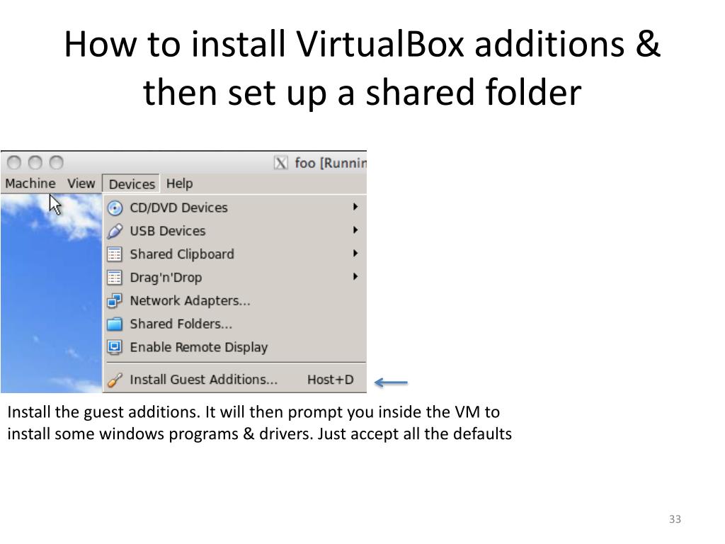 How to install VirtualBox additions & then set up a shared folder Install the guest additions. It will then prompt you inside the VM to install some windows programs & drivers. Just accept all the defaults