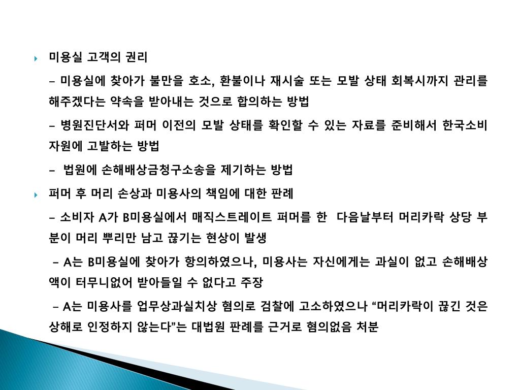미용실 고객의 권리 - 미용실에 찾아가 불만을 호소, 환불이나 재시술 또는 모발 상태 회복시까지 관리를 해주겠다는 약속을 받아내는 것으로 합의하는 방법 - 병원진단서와 퍼머 이전의 모발 상태를 확인할 수 있는 자료를 준비해서 한국소비자원에 고발하는 방법 - 법원에 손해배상금청구소송을 제기하는 방법 • 퍼머 후 머리 손상과 미용사의 책임에 대한 판례 - 소비자 A가 B미용실에서 매직스트레이트 퍼머를 한 다음날부터 머리카락 상당 부분이 머리 뿌리만 남고 끊기는 현상이 발생 - A는 B미용실에 찾아가 항의하였으나, 미용사는 자신에게는 과실이 없고 손해배상액이 터무니없어 받아들일 수 없다고 주장 - A는 미용사를 업무상과실치상 혐의로 검찰에 고소하였으나 “머리카락이 끊긴 것은 상해로 인정하지 않는다”는 대법원 판례를 근거로 혐의없음 처분