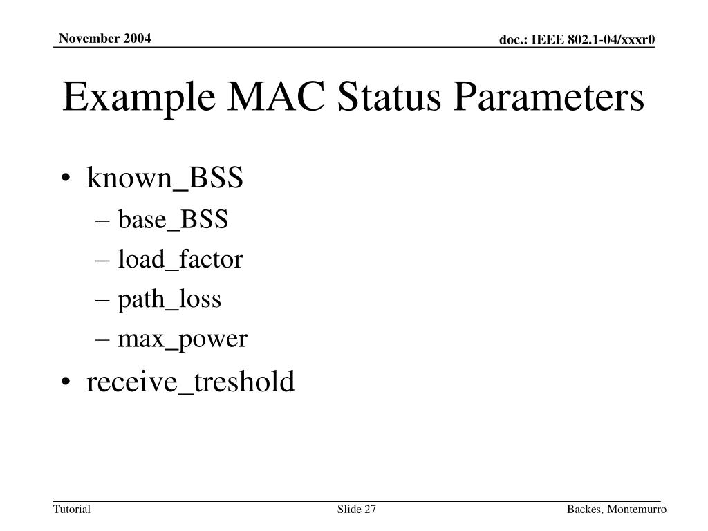 Example MAC Status Parameters • known_BSS • base_BSS • load_factor • path_loss • max_power • receive_treshold Backes, Montemurro