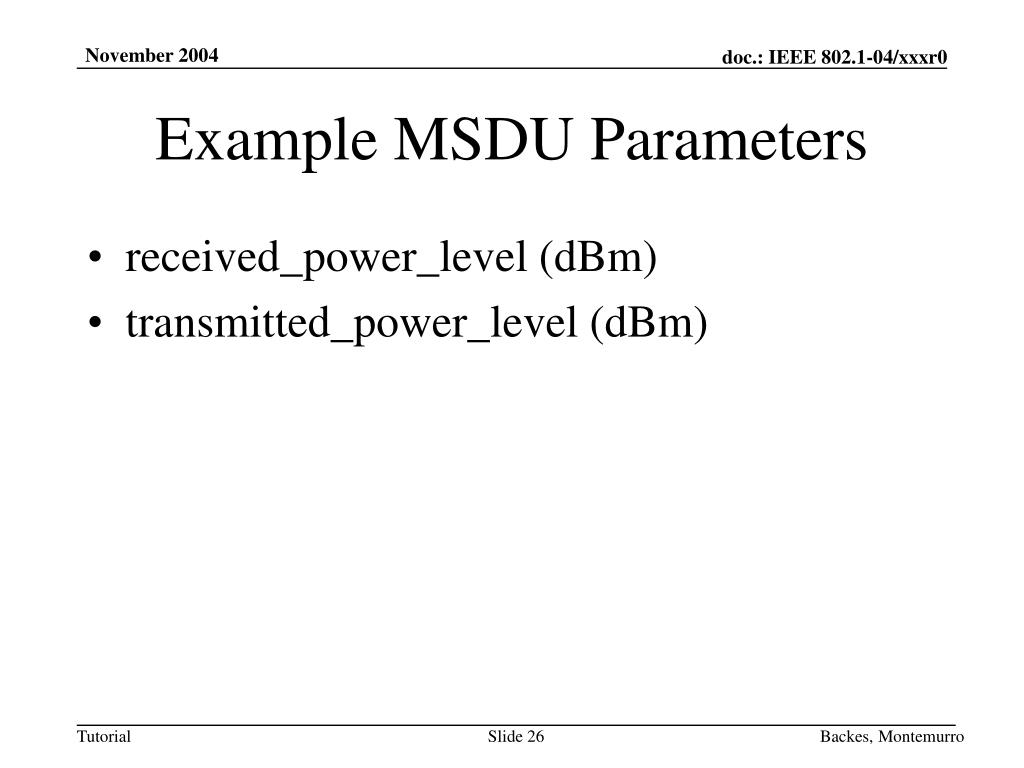 Example MSDU Parameters • received_power_level (dBm) • transmitted_power_level (dBm) Backes, Montemurro
