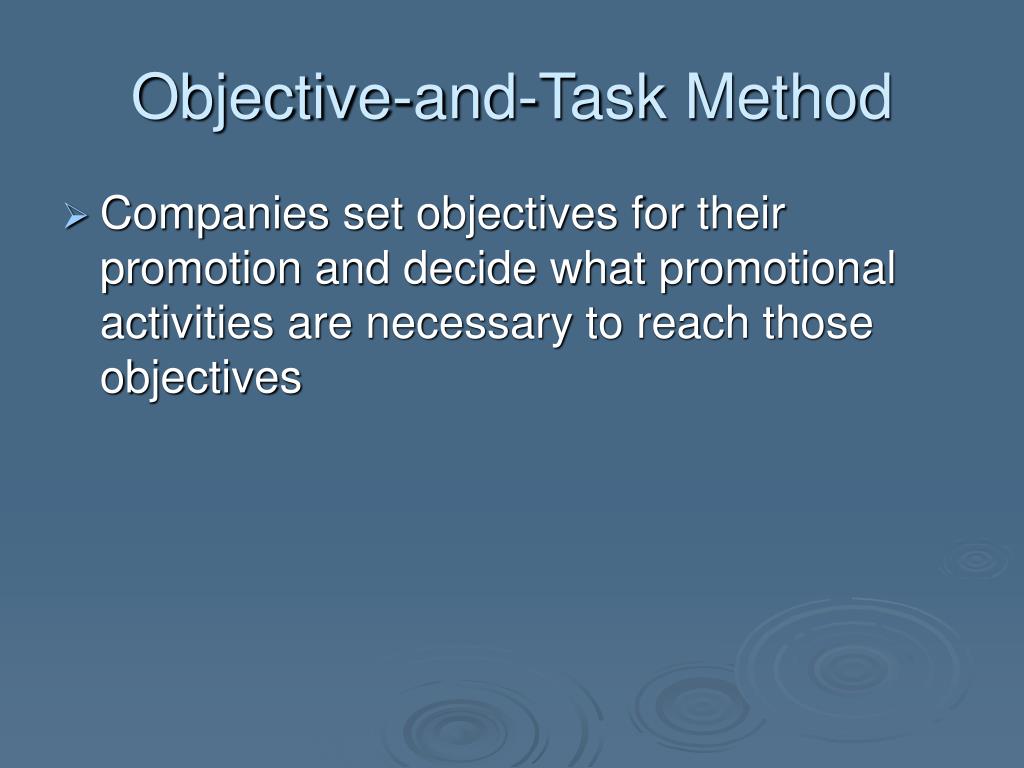 Objective-and-Task Method • Companies set objectives for their promotion and decide what promotional activities are necessary to reach those objectives
