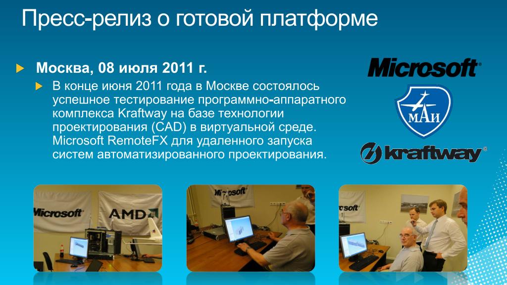 Пресс-релиз о готовой платформе • Москва, 08 июля 2011 г. • В конце июня 2011 года в Москве состоялось успешное тестирование программно-аппаратного комплекса Kraftway на базе технологии проектирования (CAD) в виртуальной среде. MicrosoftRemoteFX для удаленного запуска систем автоматизированногопроектирования.