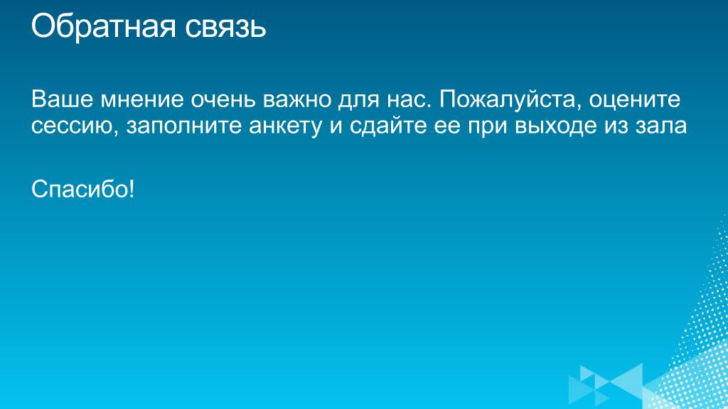 Обратная связь Ваше мнение очень важно для нас. Пожалуйста, оцените сессию, заполните анкету и сдайте ее при выходе из зала Спасибо!