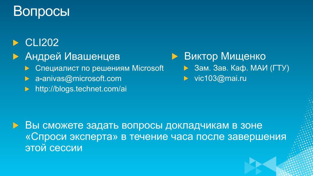 Вопросы • CLI202 • Андрей Ивашенцев • Специалист по решениям Microsoft • a-anivas@microsoft.com • http://blogs.technet.com/ai • Вы сможете задать вопросы докладчикам в зоне «Спроси эксперта» в течение часа после завершения этой сессии • Виктор Мищенко • Зам. Зав. Каф. МАИ (ГТУ) • vic103@mai.ru