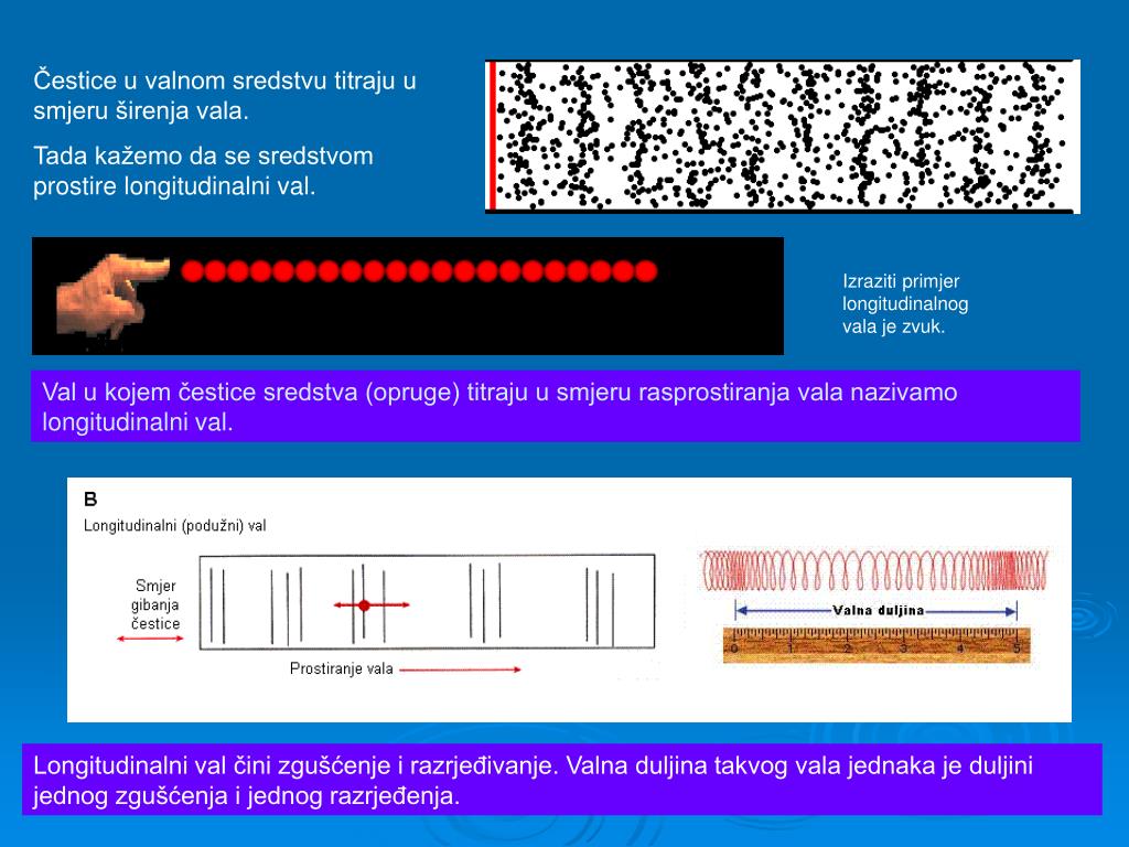 Čestice u valnom sredstvu titraju u smjeru širenja vala. Tada kažemo da se sredstvom prostire longitudinalni val. Izraziti primjer longitudinalnog vala je zvuk. Val u kojem čestice sredstva (opruge) titraju u smjeru rasprostiranja vala nazivamo longitudinalni val. Longitudinalni val čini zgušćenje i razrjeđivanje. Valna duljina takvog vala jednaka je duljini jednog zgušćenja i jednog razrjeđenja.