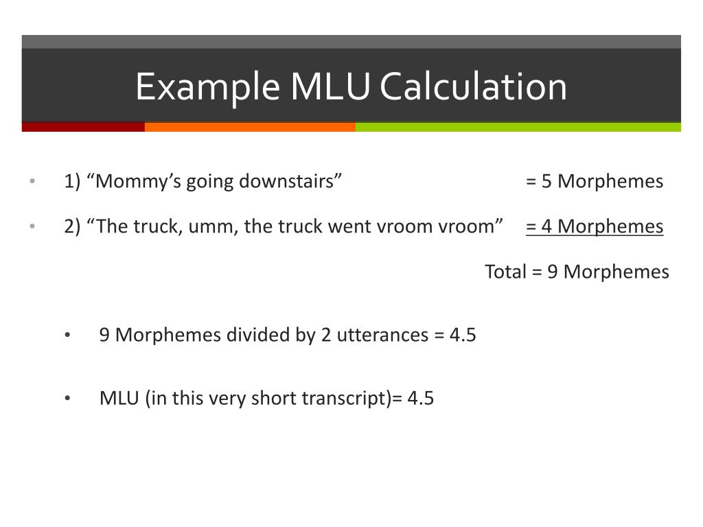 Example MLU Calculation • 1) “Mommy’s going downstairs” = 5 Morphemes • 2) “The truck, umm, the truck went vroom vroom” = 4 Morphemes Total = 9 Morphemes • 9 Morphemes divided by 2 utterances = 4.5 • MLU (in this very short transcript)= 4.5