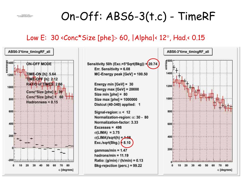 On-Off: Comparison results Low E (peak~100 GeV) 30 <Conc*Size [phe] 60, |Alpha|< 12, Had.< 0.15 Exc. Exc./Sqrt(Bkg) SigmaLiMa Sensitivity % Diff. [%Crab, 50h] Exc./Sqrt(Bkg) ABS6-3TT 498 8.10 3.75 20.746.08 0% ABS6-3Tn 151 2.79 1.30 60.2552.55 -65.6% ABS6-3nT 314 5.94 2.78 28.2611.28 -26.7% ABS6-3nn ~ 0 - - - - ABS4-2TT ~ 0 - - - - ABS5-2.5TT 439 7.64 3.54 21.976.86 -5.7% ABS7-4TT 520 8.13 3.81 20.665.95 +0.4% SCL3-1TT ~ 0 - - - - SCL2.5-0.5TT ~ 0 - - - -