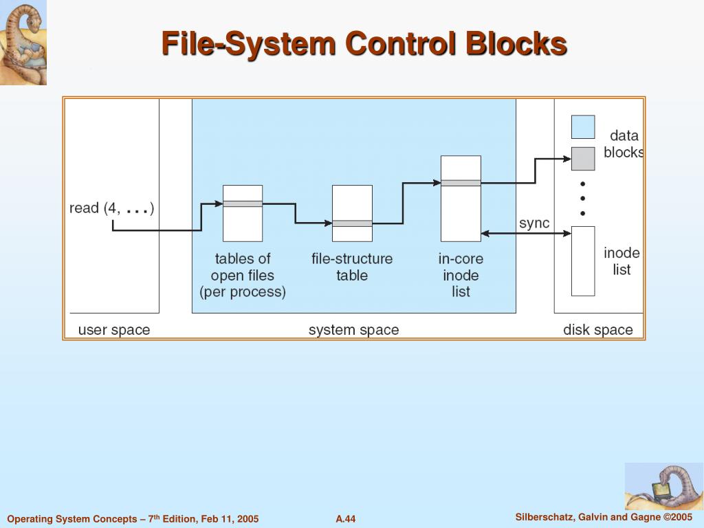 Blocks and Fragments (Cont.) • The block and fragment sizes are set during file-system creation according to the intended use of the file system: • If many small files are expected, the fragment size should be small • If repeated transfers of large files are expected, the basic block size should be large • The maximum block-to-fragment ratio is 8 : 1; the minimum block size is 4K (typical choices are 4096 : 512 and 8192 : 1024)