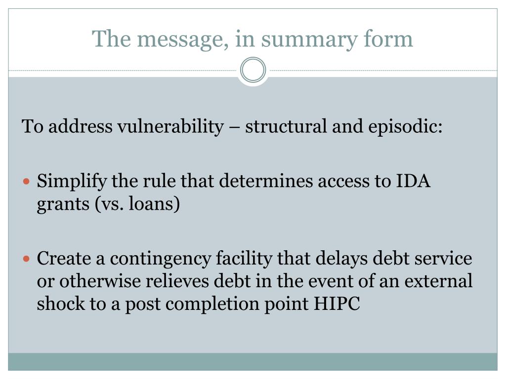 The message, in summary form To address vulnerability – structural and episodic: • Simplify the rule that determines access to IDA grants (vs. loans) • Create a contingency facility that delays debt service or otherwise relieves debt in the event of an external shock to a post completion point HIPC