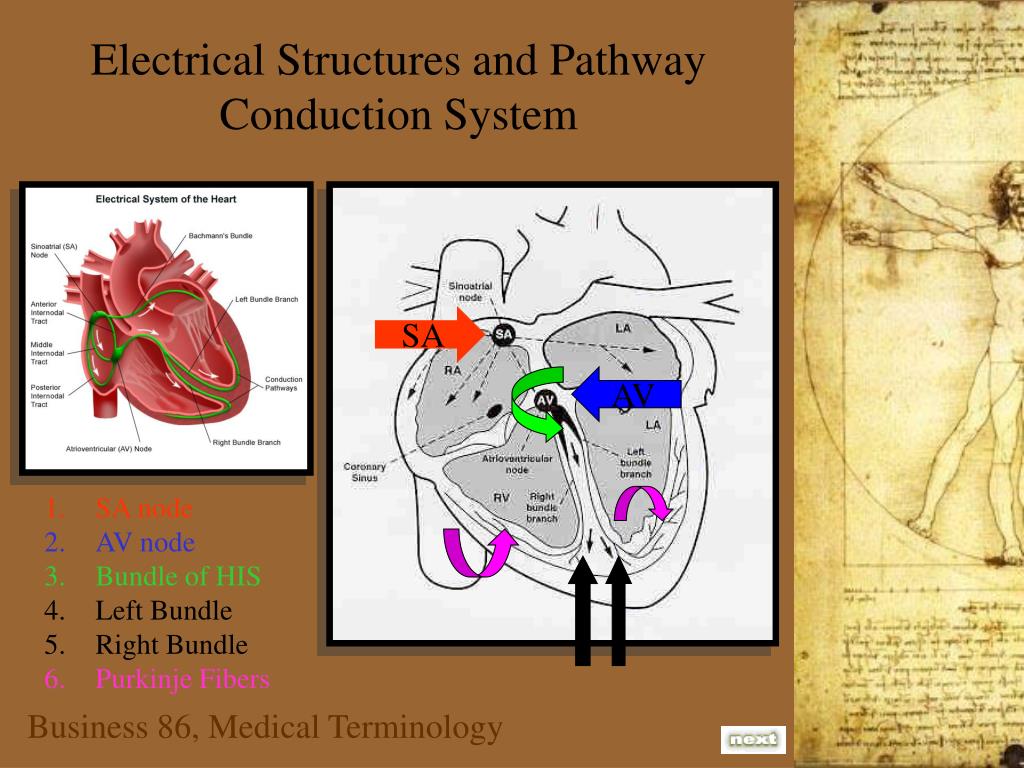 Electrical Structures and Pathway Conduction System SA AV • SA node • AV node • Bundle of HIS • Left Bundle • Right Bundle • Purkinje Fibers