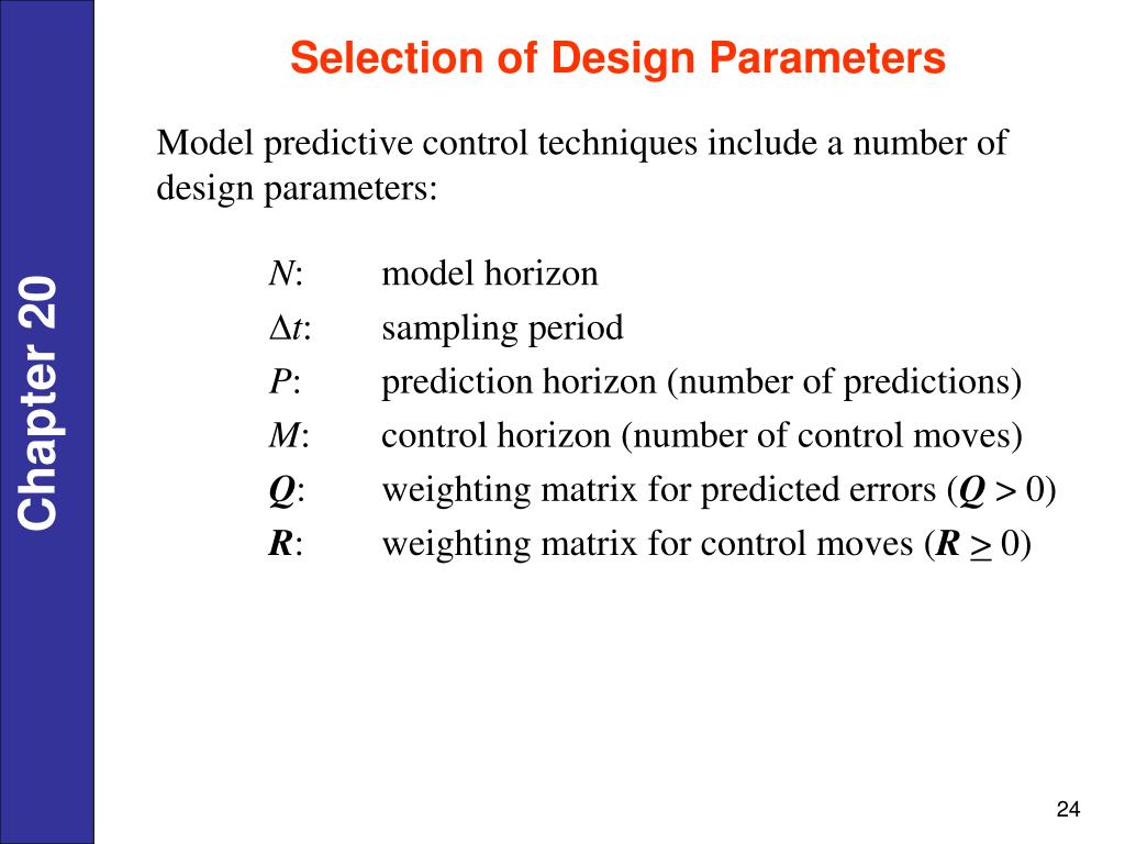 Selection of Design Parameters Model predictive control techniques include a number of design parameters: N: model horizon Dt: sampling period P: prediction horizon (number of predictions) M: control horizon (number of control moves) Q: weighting matrix for predicted errors (Q > 0) R: weighting matrix for control moves (R> 0)