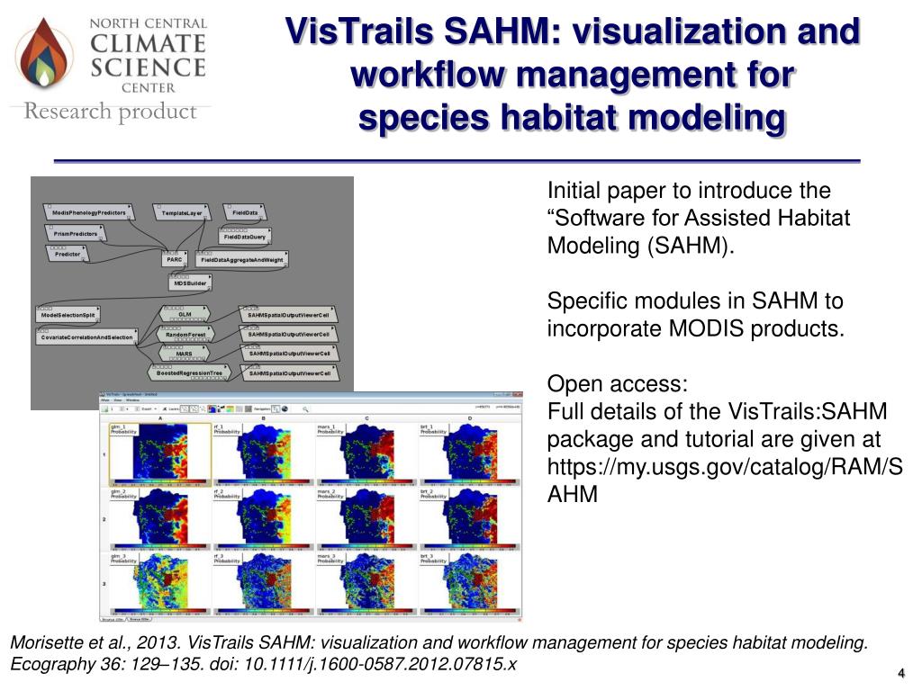 VisTrails SAHM: visualization and workflow management forspecies habitat modeling Research product Initial paper to introduce the “Software for Assisted Habitat Modeling (SAHM). Specific modules in SAHM to incorporate MODIS products. Open access: Full details of the VisTrails:SAHM package and tutorial are given at https://my.usgs.gov/catalog/RAM/SAHM • Morisette et al., 2013. VisTrails SAHM: visualization and workflow management for species habitat modeling. Ecography 36: 129–135. doi: 10.1111/j.1600-0587.2012.07815.x