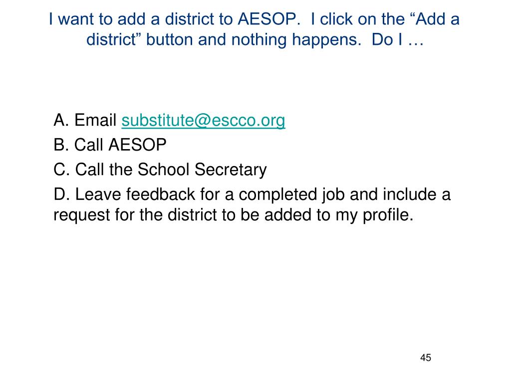 I want to add a district to AESOP. I click on the “Add a district” button and nothing happens. Do I … A. Email substitute@escco.org B. Call AESOP C. Call the School Secretary D. Leave feedback for a completed job and include a request for the district to be added to my profile.