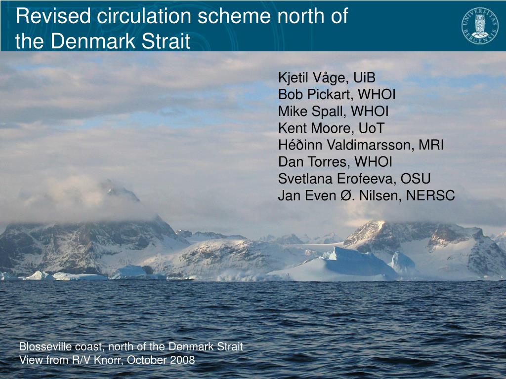 Revised circulation scheme north of the Denmark Strait Kjetil Våge, UiB Bob Pickart, WHOI Mike Spall, WHOI Kent Moore, UoT HéðinnValdimarsson, MRI Dan Torres, WHOI Svetlana Erofeeva, OSU Jan Even Ø. Nilsen, NERSC Blosseville coast, north of the Denmark Strait View from R/V Knorr, October 2008