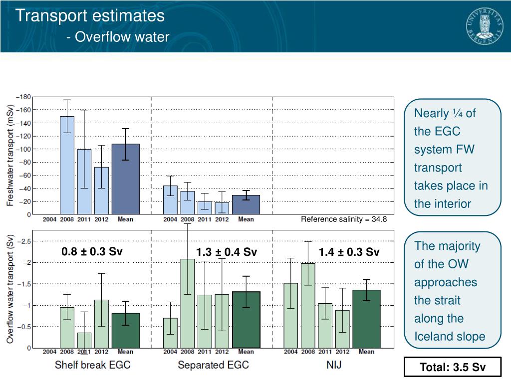 Transport estimates - Overflow water Nearly ¼ of the EGC system FW transport takes place in the interior Reference salinity = 34.8 The majority of the OW approaches the strait along the Iceland slope 0.8 ± 0.3 Sv 1.3 ± 0.4 Sv 1.4 ± 0.3 Sv Total: 3.5 Sv