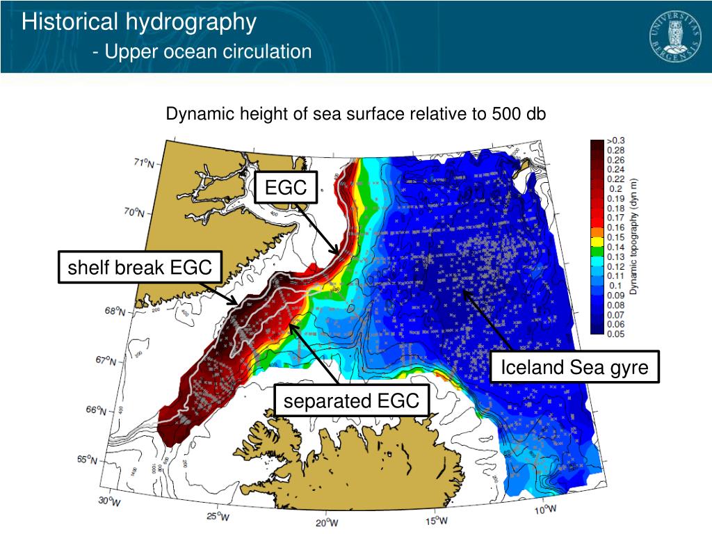 Historical hydrography - Upper ocean circulation Dynamic height of sea surface relative to 500 db EGC shelf break EGC Iceland Sea gyre separated EGC