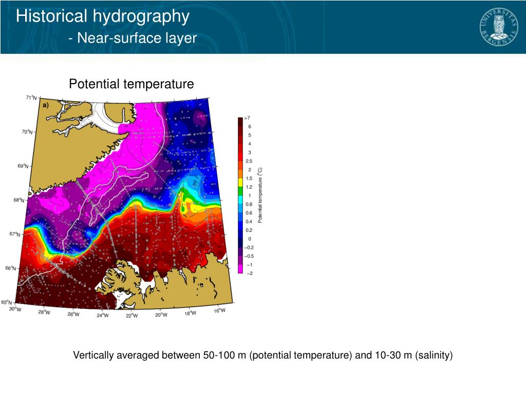 Historical hydrography - Near-surface layer Potential temperature Salinity Vertically averaged between 50-100 m (potential temperature) and 10-30 m (salinity)