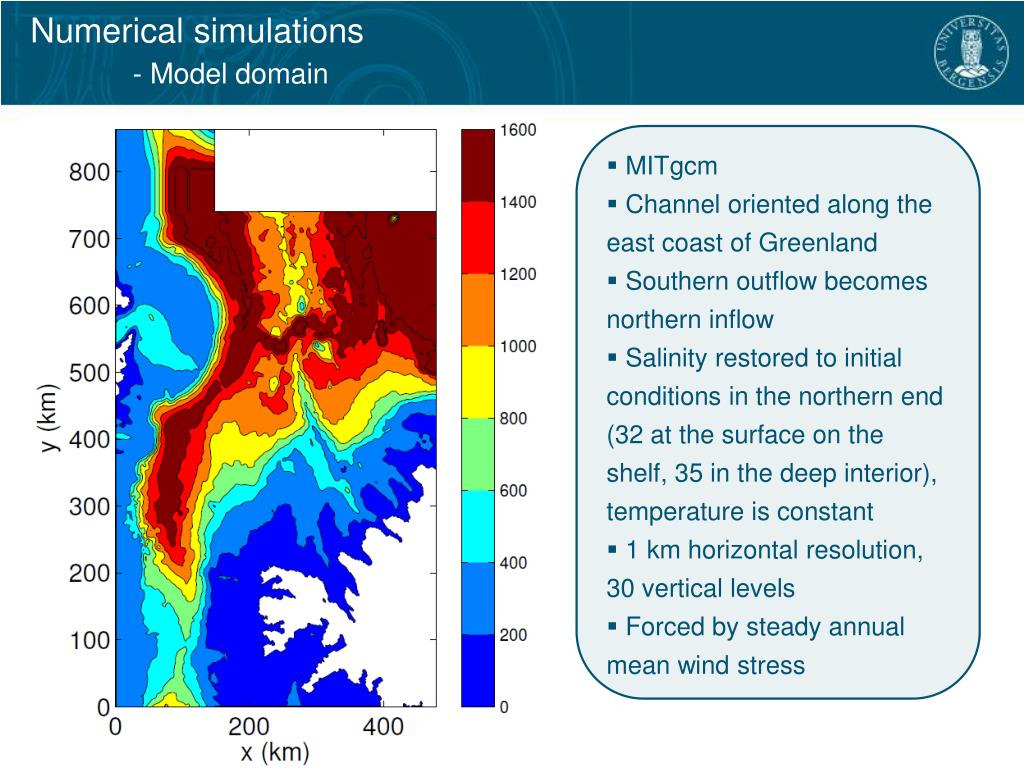 Numerical simulations - Model domain • MITgcm • Channel oriented along the east coast of Greenland • Southern outflow becomes northern inflow • Salinity restored to initial conditions in the northern end (32 at the surface on the shelf, 35 in the deep interior), temperature is constant • 1 km horizontal resolution, 30 vertical levels • Forced by steady annual mean wind stress