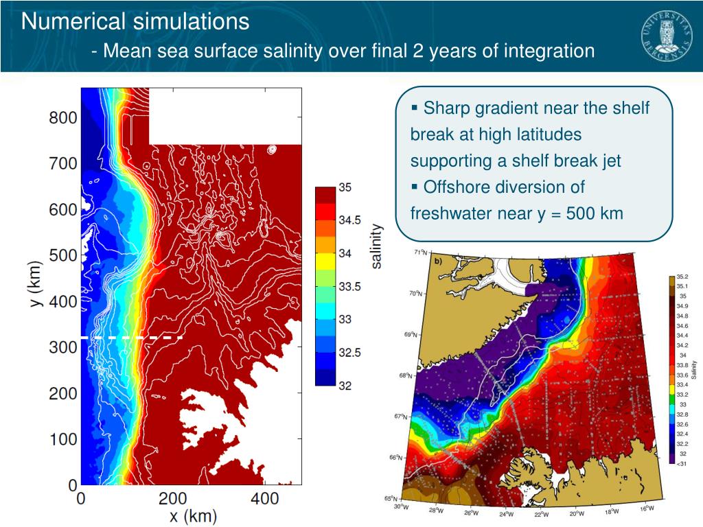 Numerical simulations - Mean sea surface salinity over final 2 years of integration • Sharp gradient near the shelf break at high latitudes supporting a shelf break jet • Offshore diversion of freshwater near y = 500 km