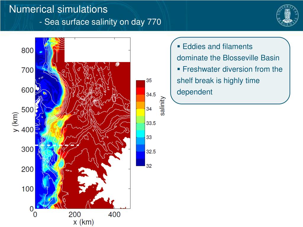 Numerical simulations - Sea surface salinity on day 770 • Eddies and filaments dominate the Blosseville Basin • Freshwater diversion from the shelf break is highly time dependent
