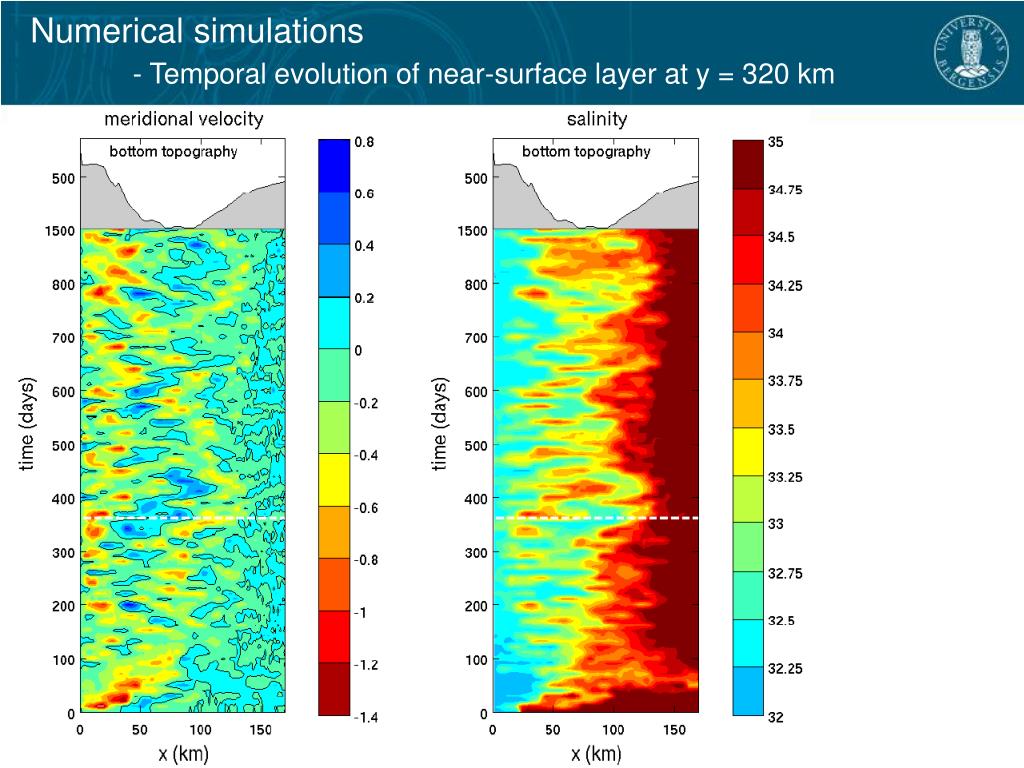 Numerical simulations - Temporal evolution of near-surface layer at y = 320 km