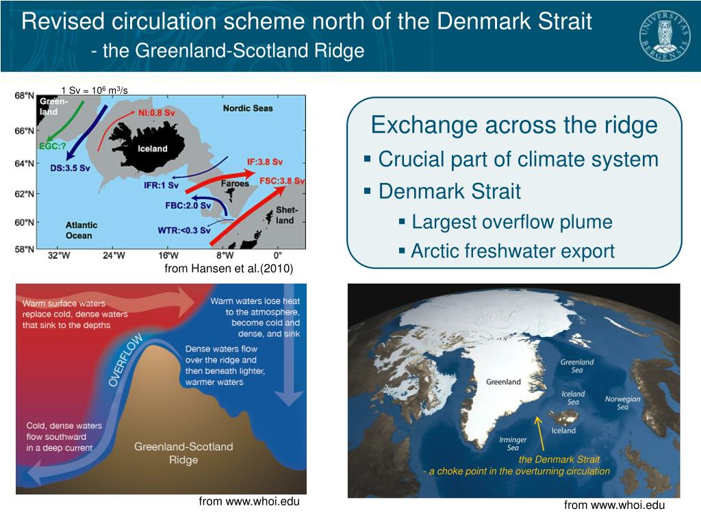 Revised circulation scheme north of the Denmark Strait - the Greenland-Scotland Ridge 1 Sv = 106 m3/s Exchange across the ridge • Crucial part of climate system • Denmark Strait • Largest overflow plume • Arctic freshwater export from Hansen et al.(2010) theDenmarkStrait - a choke point in the overturning circulation from www.whoi.edu from www.whoi.edu