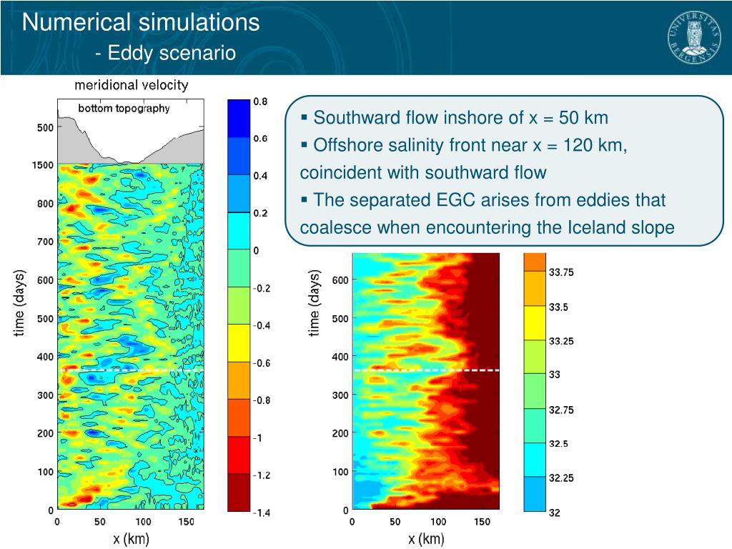 Numerical simulations - Eddy scenario • Southward flow inshore of x = 50 km • Offshore salinity front near x = 120 km, coincident with southward flow • The separated EGC arises from eddies that coalesce when encountering the Iceland slope